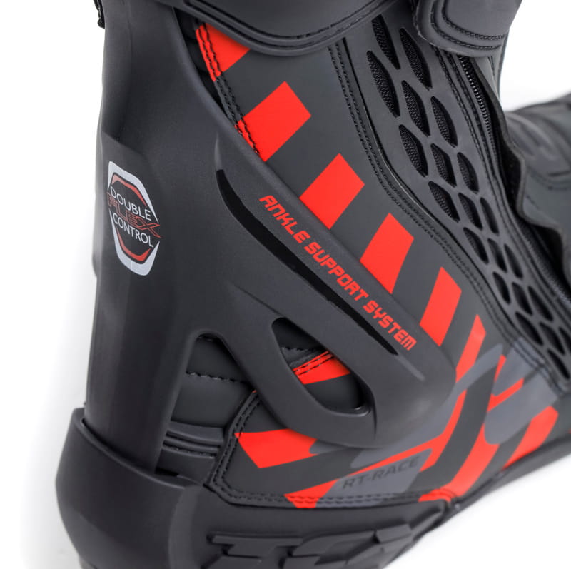 Buty motocyklowe RT-Race to ochronne, lekkie buty sportowe zaprojektowane z myślą o maksymalnym bezpieczeństwie i optymalnej kontroli motocykla. RT-Race zawiera Fasten Fit Control, system szybkiego sznurowania zintegrowany z podszewką buta, który zapewnia, że cholewka idealnie otula stopę i umożliwia milimetrową regulację dopasowania. System zamykania buta posiada aluminiową dźwignię z regulacją mikrometryczną i szybkim zwalnianiem, która idealnie dopasowuje wał do innej anatomii łydki, oraz boczny zamek błyskawiczny z elastycznym panelem. Buty motocyklowe TCX RT-Race są wyposażone w Double Flex Control Antitorsion System, połączenie wykonane z poliuretanu umieszczone w okolicy kostki, zdolne do kontrolowania ruchu do milimetra, zapewniając wsparcie i optymalną elastyczność stawu, aby uniknąć niebezpiecznych skrętów i możliwych obrażeń. Cholewka wykonana jest z mikrofibry o wysokiej odporności na zużycie. Wewnętrzna podszewka wykonana jest z oddychającej siateczki AIR TECH i ma wyściółkę o różnych grubościach umieszczoną w okolicy kostki, aby zapewnić maksymalny komfort. Na podnosku i pięcie znajdują się wymienne suwaki z poliuretanu ułatwiające poślizg w kontakcie z asfaltem. Dodatkowe wzmocnienia są umieszczane w najbardziej narażonych obszarach, takich jak goleń, kostka, palec u nogi i pięta.